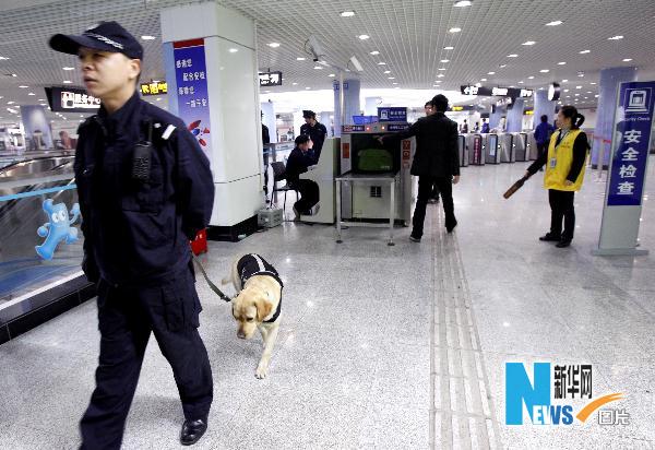 4月19日,在上海世博园浦西园区入口的西藏南路地铁站,安保人员带着警犬巡逻。新华社记者 刘颖 摄