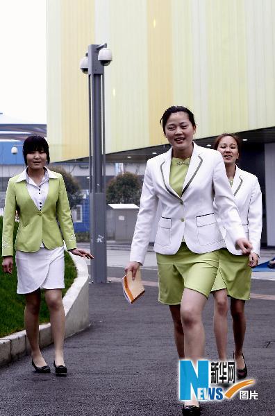 4月19日,工作人员身着正式工作制服走在园区内。 新华社记者 刘颖 摄