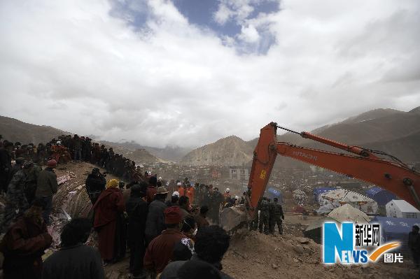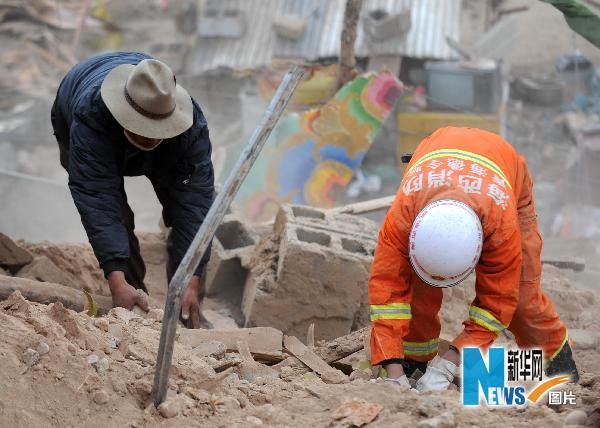 4月20日,在玉树县结古镇扎西大同村,消防队员和群众用手抛土。当日,青海玉树地震灾区出现雨雪、冰雹以及大风沙尘天气,给抗震救灾工作带来不利影响。位于结古镇扎西大同村的搜救点探测到生命迹象,专业搜救队伍冒着风雪继续全力搜救。新华社记者聂建江摄
