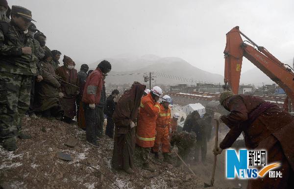 4月20日,在玉树县结古镇扎西大同村,救援人员冒雪搜救。当日,青海玉树地震灾区出现雨雪、冰雹以及大风沙尘天气,给抗震救灾工作带来不利影响。位于结古镇扎西大同村的搜救点探测到生命迹象,专业搜救队伍冒着风雪继续全力搜救。新华社记者江宏景摄