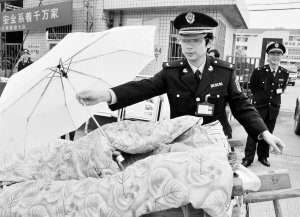 昨日上午,嵊州市公路路政管理大队在37省道嵊州段举行了公路法制宣传活动。上午10时许,天下起了小雨,一位工作人员发现一辆人力双轮车正拉着一位老年病人通行,急忙送上了自己的雨伞。