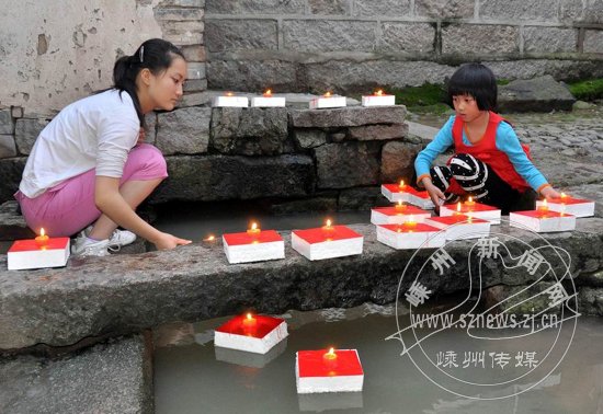 金庭镇华堂村有放河灯祈福和悼念先人的习俗,昨日,该村两个小女孩以放河灯的方式哀悼青海省玉树地震遇难同胞,并为灾区人民祈福。