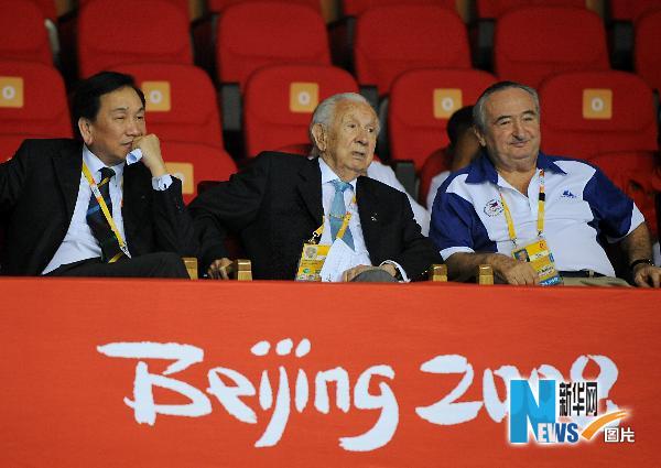 4月21日,国际奥委会终身名誉主席萨马兰奇去世。这是2008年8月13日,萨马兰奇(中)在工人体育馆观看北京奥运会拳击比赛的资料照片。新华社发