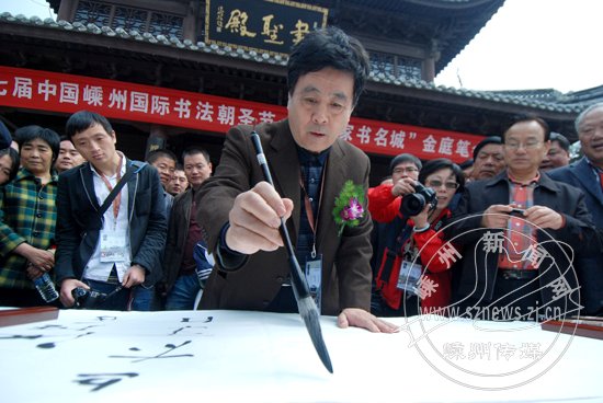在举行庄严而肃穆的民间祭祖表演后,各界代表先后向书圣墓敬献花篮,全场以深深三鞠躬,向书圣表达敬仰与追思之情。在随后举行的“名家书名城”金庭笔会上,聂成文为笔会开笔:“瀚海经年追右军,行间字里但描神;方今更踏金庭土,来拜煌煌大圣人。”道出后世书家对书圣书法艺术的景仰和对书圣精神境界的追寻。众多书法名家在书圣殿前挥毫泼墨,为书圣归隐地留下珍贵墨宝。20名华堂小学学生代表也作现场书法表演。