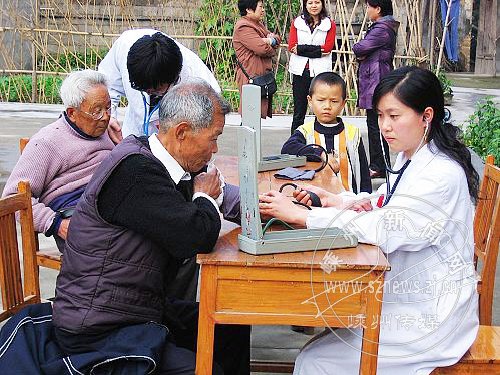 人民医院爱心网友“动脉血”的吴盈和喻佳杰为33位老人作了体检。老人们见了医生自然十分服帖,安安静静地排队等候着。他们卷起衣袖先量血压,又解开外套测心率,有的还向医生们诉说着身体上的不适。