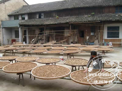 这些天来,三界镇杜联村农妇张凤招趁着晴好的天气把自种的竹笋和自制的咸菜混合熟煮后, 热气腾腾地撒在一个个竹编上进行干晒,家中的庭院成为晒笋干菜的最佳场所,“与张大妈一样,我们全村现在都在制笋干菜,而制出的笋干菜大都销往大上海。”村主任杜志军高兴地对笔者说。