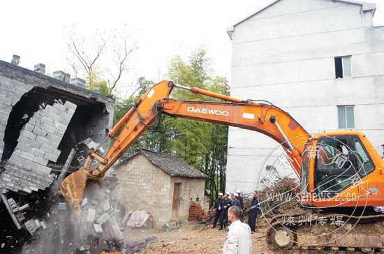 昨日下午,国土、公安、城管等部门及三江街道办事处的170多名执法人员赶赴违章建筑所在地。2点30分左右,一台挖掘机开进现场,开始强制拆除。一面面违章建筑墙体在挖掘机的轰鸣声中倒塌。到下午6点,占地近10亩的违章建筑被夷为平地,不少围观村民拍手称快。