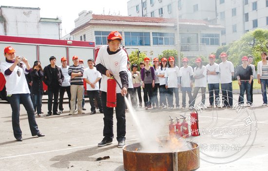 昨日 ,团市委和市公安局消防大队共同举办“迎世博、保平安”消防志愿者走进消防营活动。30多名消防志愿者代表参加活动。图为消防志愿者进行灭火演练。