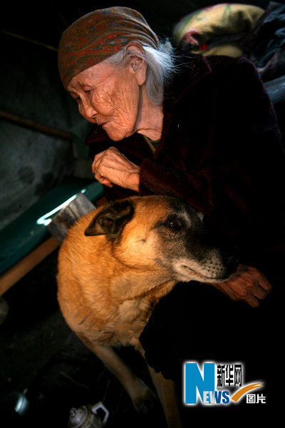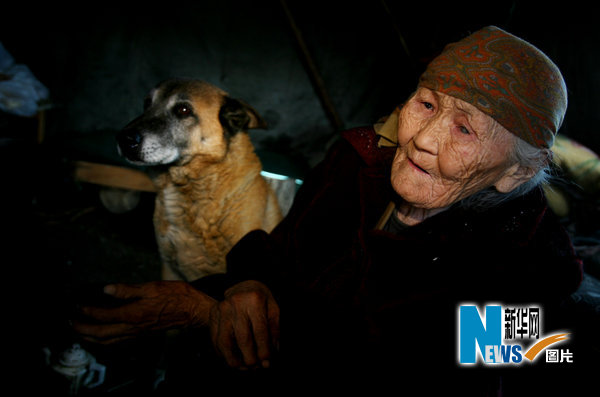 2010年4月4日,位于大兴安岭西北坡的内蒙古根河市敖鲁古雅鄂温克民族乡,驯鹿到森林里找苔藓吃的季节,猎民点的帐篷内大黄狗陪在老人身边。