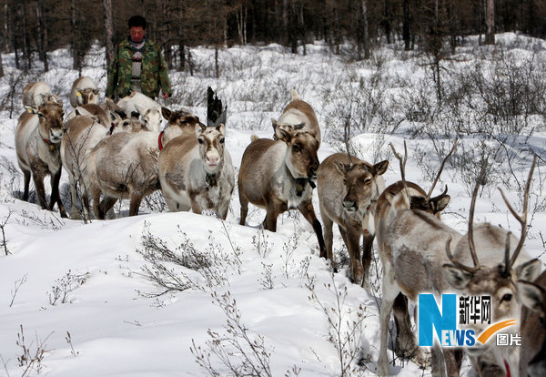 2010年4月5日,位于大兴安岭西北坡的内蒙古根河市敖鲁古雅鄂温克民族乡,大兴安岭深处驯鹿踏雪寻觅苔藓。