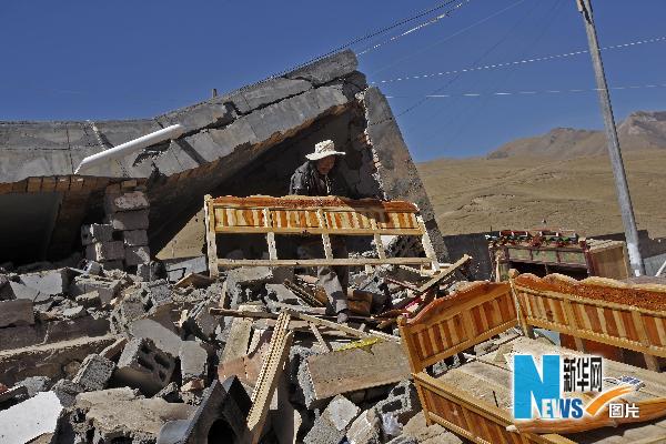 一名受灾村民从倒塌的家中挖出能用的家具。