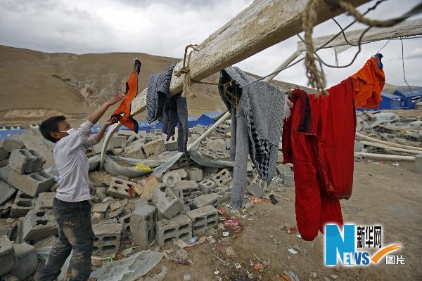 一名男孩在被地震破坏的蔬菜大棚架上晾晒衣服。
