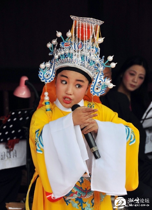 4月27日,小戏迷在浙江嵊州市甘霖镇施家岙村绳武堂古戏台上表演越剧。