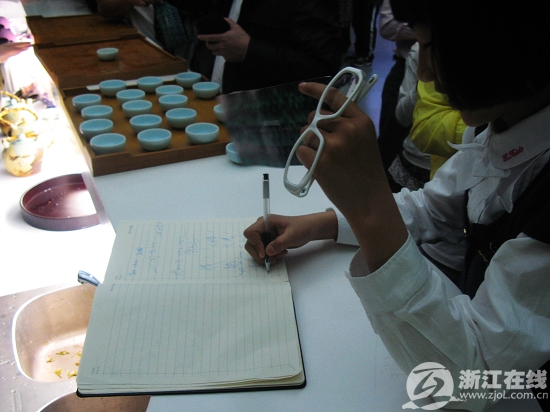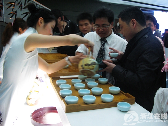 参观最后,浙江馆也给每位游客准备了一份意外惊喜——与青瓷巨碗等比例缩小的青瓷杯奉上精心炮制的龙井茶。让游客享受了视觉、听觉的冲击后,还能有更切身的味觉感受。青瓷杯与青瓷巨碗遥相呼应,将参观者的印象以青瓷杯“装”了回去,永久地固定了下来,这样的构思,不禁让人连连称妙。