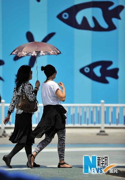 5月1日,两名游客走过世博园内的太平洋联合馆。新华社记者廖宇杰摄