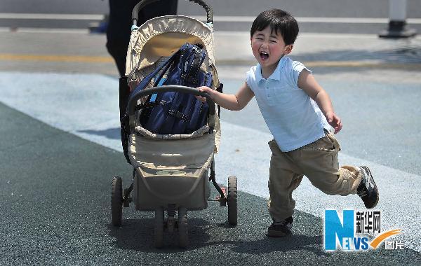 5月1日,一位小游客在世博园内拉着自己的小车奔跑。新华社记者郭大岳摄