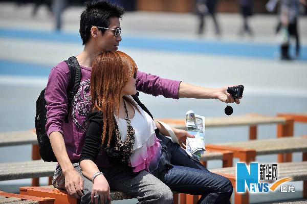 5月1日,一对情侣在世博园内自拍合影。新华社记者郭大岳摄