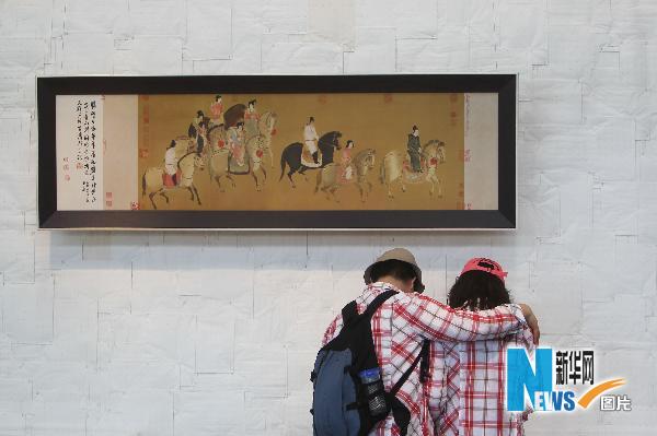 这是5月1日拍摄的世博园内两位身穿情侣衫的游客。新华社记者廖宇杰摄