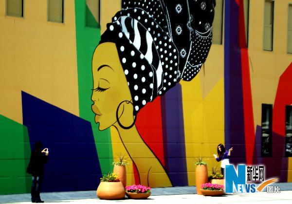 5月1日,一名游客在南非馆外留影。新华社记者张明摄