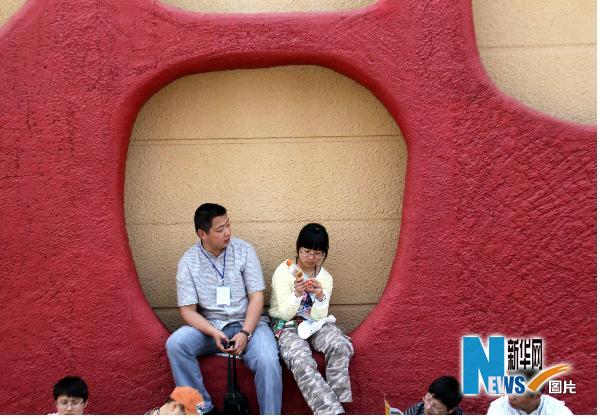 5月1日,两名游客在世博园内的土耳其馆前休息。新华社记者张明摄