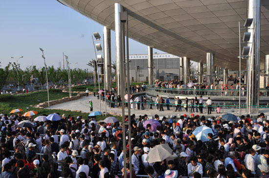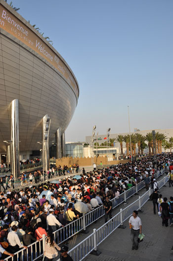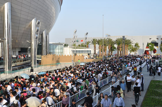 5月2日下午,沙特馆外围排满了等候进馆的游客。游客之多,队伍之密集简直可以用“密不透风”来形容。在出口处,一位刚刚参观完毕的游客告诉记者,他等候三个半小时才进馆,但是看到了世界最大的三维影院还是“物有所值”的。