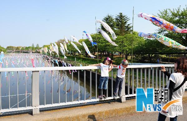 5月2日,在日本群马县馆林市鹤生田川,一位母亲在鲤鱼旗下为孩子拍照。