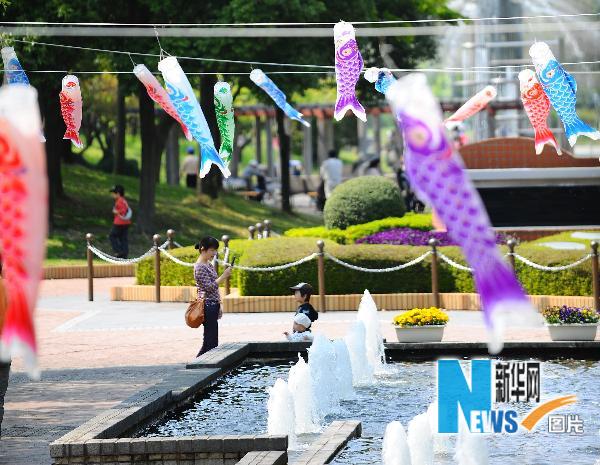 5月2日,在日本群马县馆林市躑躅公园,一位母亲在鲤鱼旗下为孩子拍照。