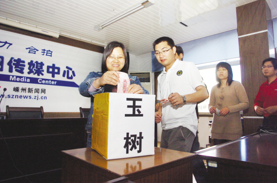 4月29日,市新闻传媒中心全体职工为玉树捐款献爱心。在写着“玉树”的捐款箱前,大家纷纷投进了自己的爱心款。 (裘冬梅)