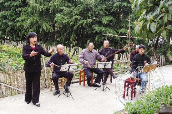长乐镇周桥村活跃着一支戏迷服务队,每到农闲时分,戏迷朋友便聚在一起唱戏,丝竹声声,越音袅袅,邻里群众赶来听戏,欢声笑语,其乐融融,形成了一道农家文化风景线。图为该村戏迷自娱自乐的场面。