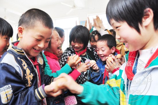 图为 5月5日贵门乡中心学校的小学生正在斗立夏蛋、争擂主的场景。