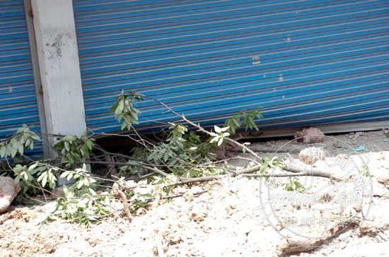 围墙内的卷闸门被石头打破