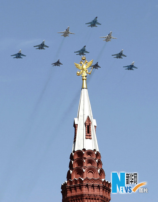 5月9日,在俄罗斯首都莫斯科,俄空军飞机参加纪念卫国战争胜利65周年阅兵式。俄罗斯当日举行阅兵式,纪念卫国战争胜利65周年。新华社/路透
