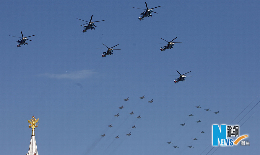 5月9日,在俄罗斯首都莫斯科举行的纪念卫国战争胜利65周年阅兵式上,战斗机编队组成“65”字样飞过。俄罗斯当日举行阅兵式,纪念卫国战争胜利65周年。新华社记者鲁金博摄