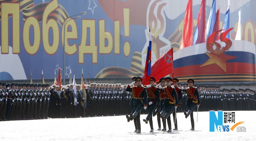 5月9日,俄罗斯士兵在首都莫斯科参加纪念卫国战争胜利65周年阅兵式。俄罗斯当日举行阅兵式,纪念卫国战争胜利65周年。新华社记者鲁金博摄