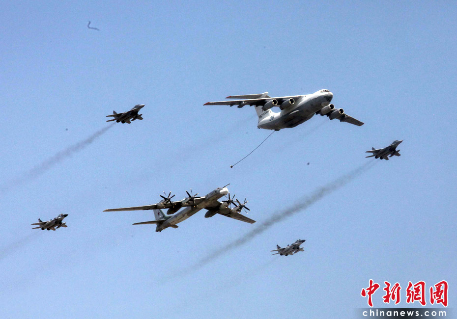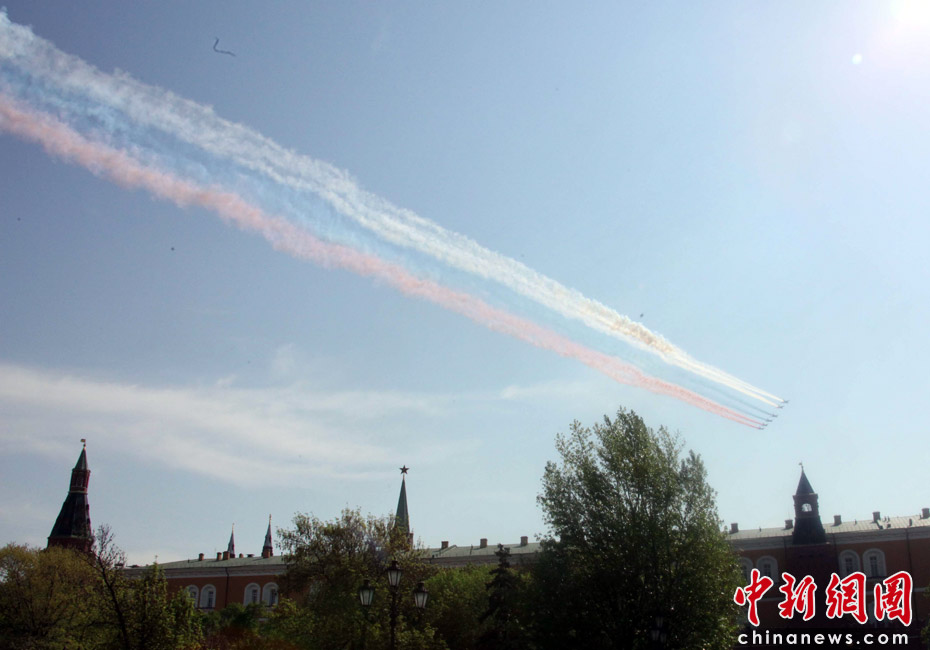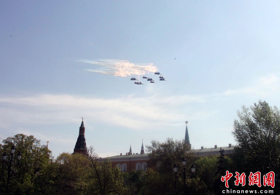 5月9日,俄罗斯在莫斯科红场举行盛大的阅兵式,庆祝卫国战争胜利65周年。莫斯科时间5月9日上午10点(北京时间9日下午2点)许,阅兵式正式开始。图为空中梯队飞越红场上空。中新网记者张朔摄
