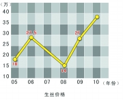 浙江省丝绸协会秘书长王伟告诉记者,作为丝绸原材料的生丝价格,在2003年曾徘徊在12万/吨的历史低位,之后向上猛进,曾在2006年两度触及27万/吨的15年高位,随后一路下滑,在2008年底下摸至14万/吨的低点后,再次上涨至今,如今已接近2006年创下的纪录。