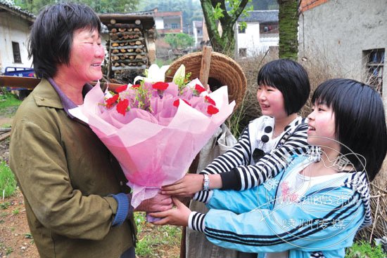 5月9日是母亲节。崇仁镇升高小学的两位学生代表和一位老师专程买来了一束康乃馨和一些礼物,走进山村送给这位普通的母亲,让她过了平生第一个母亲节!