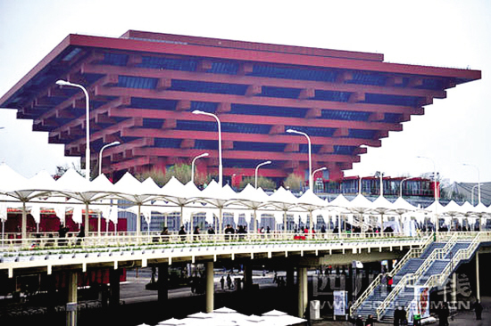 别具特色的中国馆与贯穿园区的空中廊桥相映成趣。