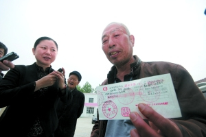 13日上午,赵作海获得国家赔偿和生活补助共65万元的支票。赵作海表示,获得的赔偿将用来给儿子盖房,娶媳妇。