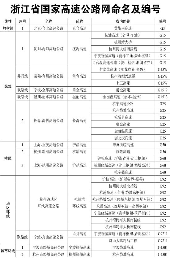 像国家高速公路命名由路线起讫的地名组成,编号则由“字母G+数字”组成,其中数字编号采用1位、2位和4位数。其中:首都放射线采用1位数,如京台高速(北京~台北高速公路)编号为“G3”;纵线和横线采用2位数,如穿越我省的“沈阳~海口高速公路”,简称“沈海高速”,统一编号为“G15”;城市环线和联络线采用4位数编号,如“宁波绕城高速公路”,编号“G1501”,杭州绕城编号为“G2501”。
