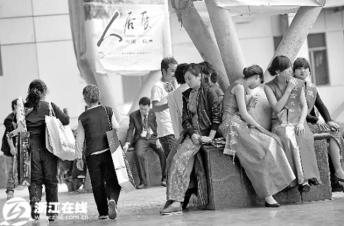 昨天是杭州市人居展最后一日,从中午开始,场馆内平淡的人气急剧下降,搬家公司的工人师傅们早早聚集在场外,礼仪小姐们也坐下休息。杨晓轩 摄