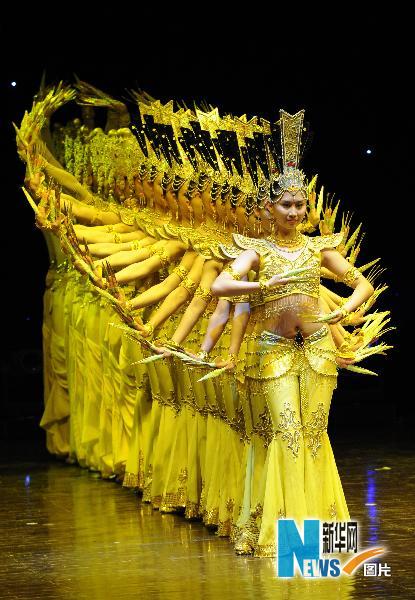 5月16日,在印度首都新德里,中国残疾人艺术团演员表演舞蹈《千手观音》。当晚,中国残疾人艺术团“我的梦”大型音乐舞蹈在新德里举行首场演出,几十名残疾人演员用精彩的表演和真挚的情感打动了到场的印度观众。新华社记者王晔摄