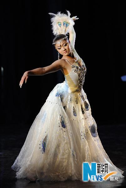 5月16日,在印度首都新德里,中国残疾人艺术团演员表演舞蹈《孔雀舞》。当晚,中国残疾人艺术团“我的梦”大型音乐舞蹈在新德里举行首场演出,几十名残疾人演员用精彩的表演和真挚的情感打动了到场的印度观众。新华社记者王晔摄