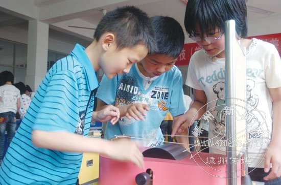 昨日下午,由市科技局、科协和教体局联合主办的“科技大篷车进校园活动”走进了逸夫小学,好奇的小学生们在仪器前快乐地探究着科学的奥秘(图二)。副市长齐方良,市政协副主席、科协主席袁辉尧参加活动。