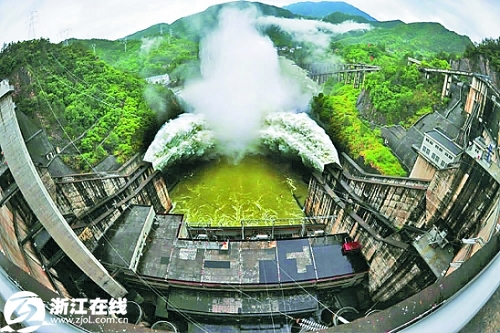下图:云和紧水滩水库22日开闸泄洪,这是该电站近4年来第一次开闸泄洪。