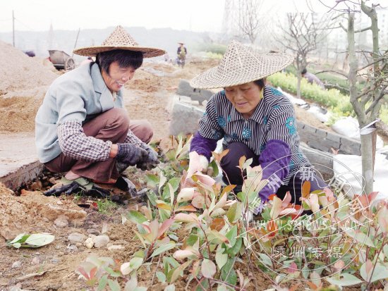 近日,园林工人在插种红叶石楠、金边黄杨、杜鹃等花木,把长乐江南堤装扮得非常有特色。