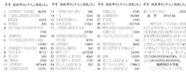 青海玉树地震发生后,饱含社会各界真情的爱心捐款不断送到市红十字会。截止5月20日,市红十字会共收到价值301680元的药品,已于4月19日托运至青海省红十字会;收到捐款533277.40元,除支付药品托运费1720元外,余款531557.40元已于5月21日汇缴浙江省红十字会。现将市红十字会4月24日至5月20日收到的捐款情况公告如下(按捐赠顺序排列):