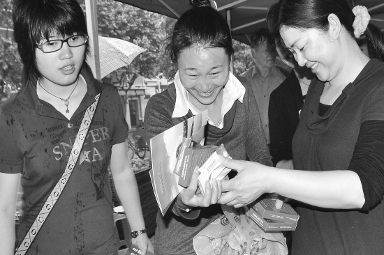 嵊州市人口和计划生委员会在今年的科技月活动中,专门对该市外来妇女进行生育知识的关爱和引导。图为近日几名外来妇女获赠计生用品。(来源:天天商报)