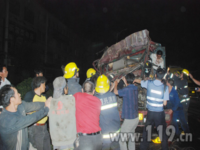 很快,消防官兵拿来液压剪扩器、液压救援顶杆、撬棒、切割机、班安全绳、氧气割机等器材,快速拆卸困住伤员和致使两车“粘”在一起的零部件,并把安徽牌货车驾驶员座位下轮胎内的气慢慢放掉,以来增大救援空间。“坚持一下,马上就好了,要相信消防战士,千万别睡着了,一定要坚持住。”救援现场,被困司机表哥赵某不停地在一旁为其打气。22时19分,在拖车的配合下,消防官兵及时将“粘”着的两车解体。22时31分,在交警和现场群众的帮助下,成功地把被困司机救出变形的驾驶室。