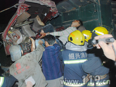 事发后,嵊州市消防、交警、“120”急救中心等救援人员相继赶到现场处置。笔者在事故现场看到,一辆安徽牌照货车的车头撞在一辆江西版照半挂货车的车尾,地面上都是碎玻璃和汽车零部件,追尾货车的车头严重变形,整个驾驶室面目全非,车头钻进了半挂货车尾部,致使俩车“粘”在一起。由于撞击力度较大,追尾货车将半挂货车顶出了三米多。“伤者身上有多处伤口,右腿骨已经碎裂,若失血很多,随时都会有生命危险,要及时送医院救治”。现场医护人员在检查完被困人员伤势后,不停提醒救援人员赶紧救人。